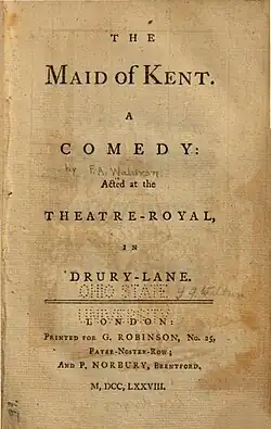 The Maid of Kent is a 1773 comedy play by the English writer Francis Godolphin Waldron.[1] It premiered at the Theatre Royal, Drury Lane on 17 May 1773.[2] The original cast included William Parsons as Sir Thomas Richacre, John Hayman Packer as Doctor Goodman, Francis Godolphin Waldron as Metre, John Palmer as George, Joseph Vernon as William, John Moody as O'Connor, Robert Baddeley as La Poudre, Richard Griffith as Robert, Elizabeth Younge as Emily, Jane Pope as Patty and Mary Bradshaw as Dame Quickset.