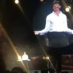 Warren Carlyle was signed as the creative director for the show, while Ashley Wallen choreographed the dancers through intricate dance steps.[20] The large main stage was elevated and set up at the end of the arenas, with a long runway extending from its middle, the pathway ended into a round-shaped front.[21] The tour featured costumes from Tom Ford including, a black snake-print velvet jacket, a metallic silver jacket and an ensemble of white shirt with pleated bib, silk-satin cummerbund and black fedora.[22][23][24][25][26]