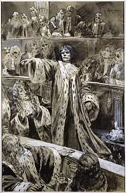 ![]() The Man Who Laughs - Gwynplaine delivering his speech in the House of Lords (drawing by Georges-Antoine Rochegrosse, Victor Hugo's house, circa 1886) | |