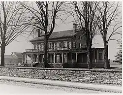 On the west is a large two-story wing that was added later. It has a gabled roof of lower pitch than the main block, and bracketed cornices on the north and south elevations. A small one-story shed-roofed wing projects from the north.[1]