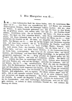 The story begins with a one-sentence paragraph – the widowed Marquise von O. places an announcement in the newspapers in a prominent north Italian town, saying she is pregnant and wishes the father of her child to come to her so she can marry him.