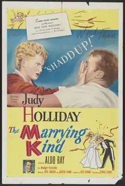 The Marrying Kind is a 1952 American comedy drama film directed by George Cukor and starring Judy Holliday and Aldo Ray. Other cast members include John Alexander, Charles Bronson, Peggy Cass, Barry Curtis, Tom Farrell, Frank Ferguson, Ruth Gordon (who co-wrote the screenplay with Garson Kanin), Gordon Jones, Madge Kennedy, Nancy Kulp, Mickey Shaughnessy, and Joan Shawlee.[2]