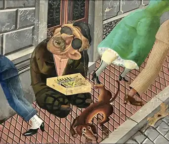 The Match Seller (German: Streichholzhändler) is a 1920 oil painting with collage elements by the German Dada and Neue Sachlichkeit artist Otto Dix. Completed one year after the end of World War I (then known as the Great War), the composition depicts a crippled and homeless veteran match seller who is ostensibly ignored by bourgeois passersby on a street in Germany.