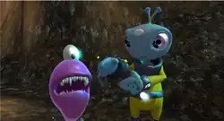 The Maw is set in a futuristic universe. The game begins with Frank, a pacifist bipedal alien, and The Maw, a purple one-eyed creature with small- medium teeth, both having been captured by the Galactic Bounty Hunters.[1] For unknown reasons the ship on which they are being held crash lands on a strange planet, killing all the crew. Alone, they set out for a communications tower in the distance while on the run from additional Galactic Bounty Hunters who have come to recapture them.[2]