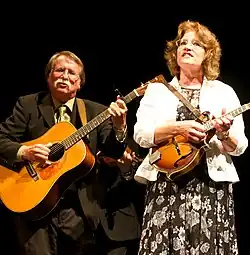 Ruth McLain Smith (b. Ruth Helen McLain[49] in 1958[16]) plays mandolin, double bass, and sings.[36] When the band formed in 1968, she stood on chairs and milk crates to reach the neck of her bass.[51] On December 15, 1970, she played the Appalachian dulcimer for the White House on national television after only 2–6 weeks of learning the instrument.[52][8] In 2007, Ruth was playing regularly with Grandpa Jones' family.[12] She has a Bachelor of Arts from Berea College, and by 2016, was a lecturer of music education at Morehead State University (MSU).[53] Still teaching at MSU in 2023, she was nominated by the International Bluegrass Music Association as their mentor of the year, an award that "honors a bluegrass professional who has impacted the lives and careers of newcomers to the bluegrass industry."[54]