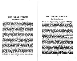 The Meat Fetish: Two Essays on Vegetarianism was then published by the Public Publishing Company, at the First National Bank Building, in Chicago, Illinois. It was described as an "interesting and comprehensive primer on vegetarianism" in an advertisement taken out in the periodical Land and Freedom. The advertisement column also directs the reader to "Send the Packers Packing! Why eat filth when it is quite unnecessary? Learn to do without by reading The Meat Fetish."[14] The identical advertisement also appears in the periodicals Single Tax Review, as well as The Public. In 1907, the cost for one copy of The Meat Fetish pamphlet was post-free with 10 cents of postage stamps, or twelve copies for 1 dollar with postage paid.[14]