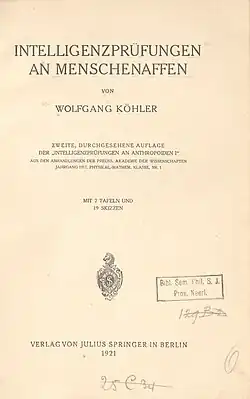 - ^ a b c d e f g Köhler, Wolfgang; Köhler, Wolfgang (1921). Intelligenzpru¨fungen an Menschenaffen (2. durchgesehene Aufl. der "Intelligenzprüfungen an Anthropoiden I." ed.). Berlin: J. Springer.