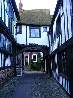 The black and white timber-framed and tiled building, with dark oak and carved stone chimney pieces,[5][13] was constructed in the mid-15th century;[6] the author of Old Sussex Inns identifies 1426 as the date.[5] Some of the timber was taken from ships that had been broken up.[5] The south-facing elevation, the oldest section apart from the cellars, has a five-window range to the upper storey and attic space above. The upper storey is jettied, and the section to the west extends over the entrance to the inner courtyard and former stable area. This overhang is supported on wooden columns with brackets and cross-beams.[6][7] The north-facing section, beyond courtyard, is also timber-framed but with brick facing and infilling. It rises to two storeys with two windows on each and a dormer above.[6] This, and the east and west ranges, are 16th-[7] and 18th-century.[6] The tiled roof has one gable end.[6]