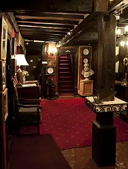 The chimney is made of Caen stone and embellished with decorations. The secret passages that existed in the inn have now been converted into fireplaces. The Giant's Fireplace Bar features an inglenook fireplace which is supported by a beam that traverses the room.[14] Other low panelled rooms, contain large Tudor[6] fireplaces and dog grates (a freestanding basket grate intended to hold wood for the fireplace). Monogram, names and dates are carved on the stone fireplaces, including "1643", "1646", and "Loffelholtz".[15] Some of the chairs are elaborately carved and were made from ships' timbers.[5]
