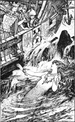 ![]() The mermaid approaches the king with an offer: his unborn son for calming the storm. Artwork by Henry Justice Ford (1904). | |