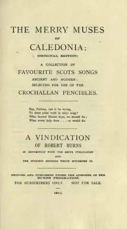 In 1911 an edition was printed by the Burns Federation. The title page reads: The Merry Muses of Caledonia; A Collection of Favourite Scots Songs Ancient and Modern; Selected for Use of the Crochallan Fencibles. It also includes an essay, entitled A Vindication of Robert Burns in connection with the above publication and the spurious editions which succeeded it..[1] This edition had a moral tone, and intended to challenge the collection's notoriety, and its identification as pornography. It also attempted to identify the authorship of some of the poems.[2]