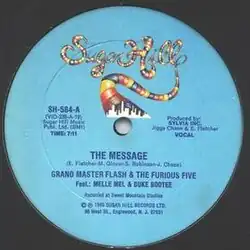 "The Message" is a song by the American hip hop group Grandmaster Flash and the Furious Five. It was released as a single by Sugar Hill Records on July 1, 1982, and was later featured on the group's debut studio album of the same name. The song was first written in 1980 by rappers Duke Bootee and Melle Mel in response to the 1980 New York City transit strike, which is mentioned in the song's lyrics.[3]