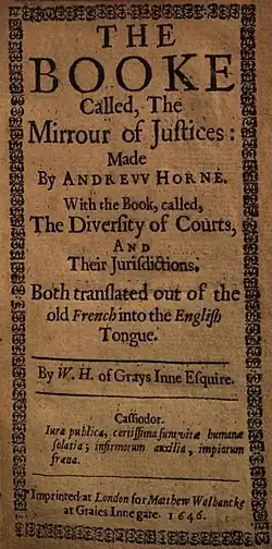 - ^ a b Andrew Horn (1646), The Booke Called, The Mirrour of Justices: Made by Andrevv Horne. With the Book, Called, The Diversity of Courts, and their Jurisdictions. Both Translated out of the Old French into the English Tongue. By W. H. of Grays Inne Esquire., W[illiam] H[ughes], transl. (1st English ed.), London: Imprinted ... for Matthew Walbancke at Graies Inne gate, OCLC 560061345.
