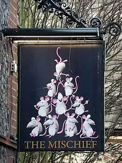 The pub was called The Wine Vaults, trading under Carter Steward and Co Wine Vaults in the 1890s until being renamed The Mischief in 1963. The name is derived from the John Crome's depiction of William Hogarth's The Man with the Load of Mischief or Man Loaded with Mischief, which showed a man carrying a woman on his back, who is drinking gin and holding a monkey and magpie, a representation of mischief, which once hung outside the pub. Considered sexist, the sign was changed to depict a mischievous boy and later a group of mice.[4] Crome's "famous" sign was included in a 1936 exhibition of pub signs held in London.[5] The pub became a grade II listed building on 26 February 1954.[3]