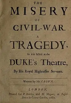 The Misery of Civil War is a 1680 tragedy by the English writer John Crowne. It was originally staged by the Duke's Company at the Dorset Garden Theatre in London. The play was staged at the height of the Popish Plot, something Crowne addressed in his prologue. Although he states that "by his feeble skill 'tis built alone, The Divine Shakespeare did not lay one Stone" the plot in fact drew heavily on Henry VI, Part 2 and Part 3 [1]