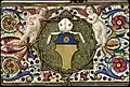 The frontispiece (fo 6 vo, reproduced at the top of the page) contains a decoration covering the entire page and is used to frame the incipit of the missal text written in gold capital letters. The small central frame containing the text was cut out at an unknown date and remains empty today. The text was inscribed in a large carved altarpiece placed on an altar. The front of this altar is decorated with a bas-relief depicting the Triumph of Neptune and Amphitrite, inspired by the decoration on an Ancient Roman sarcophagi, now in the Villa Medici.[2][13]