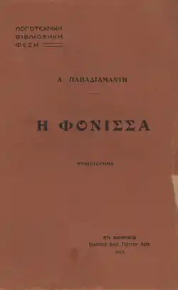 The Murderess (sometimes found as Fonissa; Greek: Ἡ Φόνισσα, romanized: Hē Fónissa) is a 1903 social novel by Greek writer Alexandros Papadiamantis. Written in the Greek katharevousa, it consists of 17 chapters and was originally published in pieces in the magazine Panathenaea from January to June 1903. The book was first published in 1912 containing five more Papadiamantis' works. A classic of Modern Greek literature, the novel has been a subject to both philological and criminological analysis. It has been praised for its use of the literary Greek language, its social commentary, as well as the unique way of introducing the reader to the criminal's psyche.