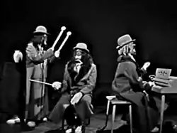 Nearly all of the Nairobi Trio skits operated in the same fashion. As "Solfeggio" plays, the gorilla with the mallets repeatedly uses the center gorilla's (Kovacs's) head like a drum at the end of every phrase, punctuating the song's sharp "ba-da-BUM" bongo riff. Every time this happens it brings a slightly changed and escalating response from the victim, who eventually tries to anticipate the mallet assaults and outwit the perpetrator. Ultimately staring him down, Kovacs, in the gorilla suit, is eventually distracted by the third gorilla, which allows the drummer to give him three final blows. The victimized gorilla then stands up and smashes a prop vase over the percussionist's head.[4] The sketch was repeated many times over the course of Kovacs's career. The audio was always "Solfeggio" but the staging changed occasionally; one variation had the first and second gorillas handling building blocks in tempo, with the third gorilla pounding at a xylophone.