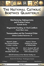 The National Catholic Bioethics Quarterly is a peer-reviewed journal that examines ethical, philosophical, and theological questions generated by the continuing progress of modern medicine and technology. It is published by the National Catholic Bioethics Center to foster inquiry on moral issues. The journal is edited by Edward Furton.[1] Online access provided by the Philosophy Documentation Center.[2]