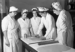 The emergence of a national cookery and domestic science school at this time is explainable by the changes in society in the late nineteenth century. Industrialisation had produced a large urban working-class, many of whom had not been taught cookery by their mothers and some of whom had only rudimentary cooking facilities in their homes. The spread of elementary schools gave an opportunity to educate working-class girls in basic cookery. At the other end of the social scale, more and more middle-class households were taking on live-in servants. These were the lower-middle classes, able often to afford just one servant, often a young girl, who had to do all the household tasks as well as cook. The servant was often a novice cook and her mistress was a novice servant-employer, so both could benefit from lessons at the School. The range of the School's activities, and the different social classes catered for, is reflected in its revised list of fees of 1921.[9] Most expensive was the Cordon Bleu course at £60. Other courses included: Household Management; Housekeeping; Ladies’ Short Cookery Course; Plain Cookery; Superior Household Cookery; Cook's Certificates In Plain And High Class Cookery; lessons in needlework, dressmaking, laundry, millinery, tailoring, and 'Odd Jobs Demonstrations'.