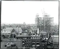 The trust sold $2.1 million of bonds to finance the construction of an apartment building, to be called the Mayflower. The 18-story, 201-foot (61 m) brick building, designed by Strickland, Blodget & Law Architects, was far taller than anything else along Newbury Street at the time. Construction had started on the second floor when Wyner was persuaded by then-Mayor James Michael Curley to make the Mayflower a world-class, 300-room hotel. Wyner received permission from the Hôtel Ritz Paris and the US-based Ritz Carlton Investing Company, founded by Albert Keller, to use the Ritz Carlton name and the Ritz-Carlton Hotel opened on May 18, 1927. Room rates were $5 to $15 per night; $40 per night for suites.[5]