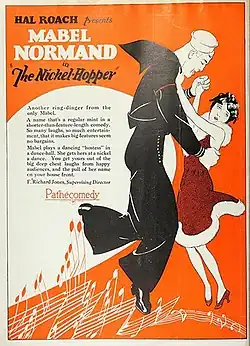 The Nickel-Hopper is a 1926 American short silent comedy film starring Mabel Normand and featuring Oliver Hardy and Boris Karloff in minor uncredited roles.[1] The film title refers to a taxi dancer's share of the dime ticket price for each dance at dance halls.