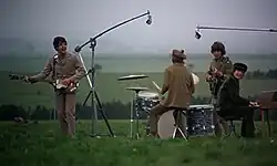 "The Night Before" was one of seven songs selected by director Richard Lester for use in Help![35] The song's film sequence was shot over 3–5 May 1965 and consists of the band miming to the track on Salisbury Plain.[36] The scene depicts an outdoor recording session,[37] with a makeshift control booth and recording equipment set up in an open field.[38] The film's premise involves Starr being targeted for assassination by a cult.[39] In line with this, the Beatles perform the song under protection of the British 3rd Royal Tank Regiment,[37] surrounded by soldiers and Centurion tanks.[40] "She's a Woman" is also used in the scene, as the character Ahme is shown attempting to trick the cultists by playing it on an underground tape recorder surrounded by dynamite. The two songs alternate with respect to the film's action. As "The Night Before" finishes, the dynamite explodes and the band runs for cover.[41]
