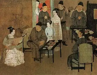 The Night Revels of Han Xizai or The Night Entertainments of Han Xizai (traditional Chinese: 韓熙載夜宴圖; simplified Chinese: 韩熙载夜宴图; pinyin: Hán Xīzaì Yèyàn Tú) is a painted handscroll attributed to Chinese 10th-century artist Gu Hongzhong. The painting depicts Han Xizai, a minister from Southern Tang under the imperial government of emperor Li Yu, accompanied with realistic portrayals of more than forty people.[2] Two copies of the artwork survived: a reproduction from the Song Dynasty, currently housed in the Palace Museum at Beijing;[1] and a replica from the Ming Dynasty, under the collection of the Three Gorges Museum at Chongqing. The painting is highly regarded as one of the greatest masterpieces of Chinese art.[3]