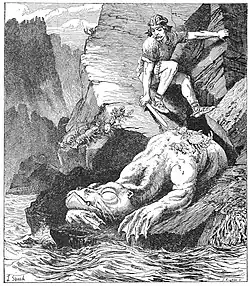 ![]() The youngest prince defeats the fierce Norka by the sea cliffs. Illustration from The Red Fairy Book. | |