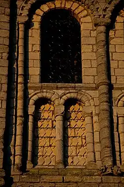 The eastern face has three, tall blank arches with large windows in all but the centre arch in the second stage, that of the northern and southern faces have only two arches, of which only one contains a window. The western face is again, more elaborate, with two blank arches, contained within them are a pair of recessed arches, similar in design to an arcade.[4][5][6][8]