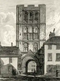 The tower was constructed under the auspices of Anslem, Abbot of Bury St Edmunds, from 1120 to 1148 as the principal gateway into the abbey.[2][4][5][6] The abbey at this time was one of the largest medieval churches in Europe, being more than 500 feet (150 m) in length, and 240 feet (73 m) wide at its western end.[7] Two other churches were built in the medieval period within the grounds of the abbey, the Church of St Denis, and the Church of St Mary.[8]