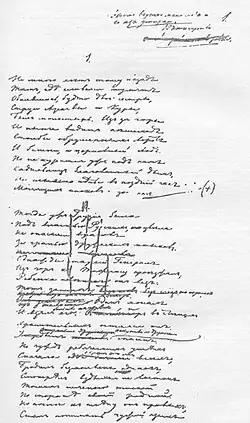 The exact date of the poem's completion, according to the autograph, was August 5, 1839. According to the same manuscript, Mtsyri was called originally Beri (A Monk, in Georgian) and featured an epigraph ("On n'a qu'une seule patria", There is only one fatherland) which later had been crossed out by the author. It was this hand-written document that allowed researchers decades later to return into the poem two fragments cut out by censors. Those were the two lines from Verse 8 ("...To learn if it if for freedom or for prison that we are born into this world") and seven lines from the penultimate Verse 25 ("...But what's in it for me? Should my spirit finds itself in Paradise, this saintly heavenly place, I'd throw away both Paradise and the Eternity // For just one chance to spend several minutes among those dark steep rock where I used to play as a child".)[3]