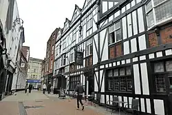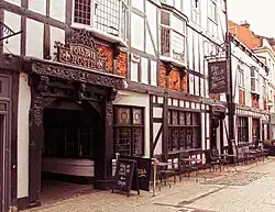 The Old Bell Hotel in Derby, Derbyshire, United Kingdom, is one of Derby's oldest and largest coaching inns. It was built in 1650,[1] in the historic street of Sadler Gate[2] in the city's Cathedral Quarter. The hotel is a Grade II listed building[3] and is included in the Derby City Statutory List of Buildings of Special Architecture or Historic Interest.[4] Although much of the building has been altered and restored, most of the original structure can still be seen from the street, consisting of a timber-framed building of four storeys with four gables, each with one window, at the top. Over the years The Old Bell Hotel has served as a coaching inn, hotel, bar, restaurant, doctors' surgery, courtroom, jail and other functions.[1]