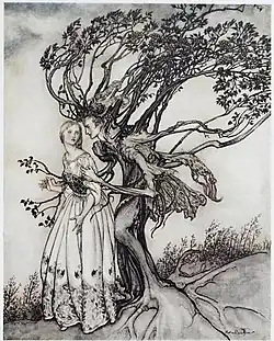 ![]() "Suddenly the branches twined round her and turned into two arms." Illustration by Arthur Rackham, 1917. | |