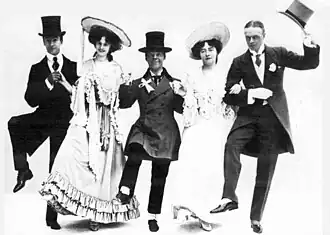 Frank Smithson directed the Broadway production, which opened at the Herald Square Theatre on 8 April 1907. It ran for 178 performances, during which time the production transferred to the Casino Theatre. It closed there on 14 September 1907. It then went on a lengthy and successful tour of the United States. It was produced by brothers Lee and Sam S. Shubert and choreographed by William Rock.[3] The production used a revised book by Joseph W. Herbert; the character of Meakin in particular was highly altered for the actor Eddie Foy, including changing the name to "Artie Choke". Herbert also created a new part for himself, the boxer and wrestler Toby Blockett. Only 12 of the musical numbers created by Caryll and Mockton were used, and the production interpolated several songs by American songwriters, including Jerome Kern, Hugo Frey, Seymour Furth and E. Ray Goetz, among others. The cast also included Trixie Friganza as Caroline, Amelia Stone as Lady Violet, Laura Guerite as Zelie, George C. Boniface, Jr. as Aubrey, Melville Ellis as Ronald, and Alfred Hickman as Guy.[3]