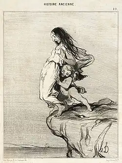 Charles Baudelaire opened "The Pagan School" with an anecdote from an event celebrating the French Revolution of 1848, where he met a young man who raised a toast to Pan and attributed the revolution to this god. At Baudelaire' inquiry, the man identified himself as a pagan and said paganism was returning after temporarily having been obscured by Christianity. He said he had seen the real gaze of Juno through an actress who portrayed her on stage. Baudelaire described the man as part of a trend of neopagans who had read too much Heinrich Heine and come to resent Christians while evoking ancient gods and celebrating beauty. According to Baudelaire, they would attribute social problems to the lack of beauty in Christianity. He used Honoré Daumier's print series L'Histoire ancienne (1842–1843), which used material from antiquity in comical and ugly ways, as a positive counter-example.
