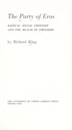 The Party of Eros: Radical Social Thought and the Realm of Freedom is a book-length contemporaneous intellectual history of the New Left written by Richard King and published by University of North Carolina Press in 1972. It analyzes the intellectual development of figures including Norman O. Brown, Paul Goodman, Herbert Marcuse, Dwight Macdonald, and Wilhelm Reich.