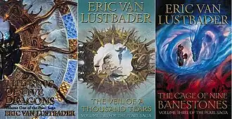 A: The answer is: no. Ideally, I would have liked to have the fourth book out long ago, but life has a way of being unpredictable. To be candid, the explosive success of my Jason Bourne books, along with my two recent thrillers, The Testament and First Daughter make a return to The Pearl series an impossibility at the moment. I know this is disappointing news for all you fans of the series. Please try to be happy with the three books you have. Sensing this might happen, I redesigned Mistress of the Pearl (Tha [sic] Cage of Five [sic] Banestones outside the United States) for a satisfying ending. If I were an octopus with four computers, I'd be able to write the fourth book at the same time as my thrillers. Alas, I only have two hands and one brain, so for the moment the series stands at three books. - ^ "Eric Van Lustbader - FAQ". Archived from the original on April 20, 2016. Retrieved 23 April 2011.