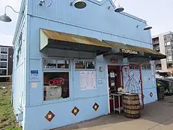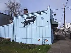 The restaurant's logo, which depicts a pig, is painted in black and blue on the side of the location of the brick and mortar space on Williams Avenue, in the north Portland part of the Eliot neighborhood.[7]