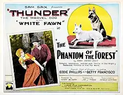 The Phantom of the Forest is a 1926 American silent Western film, also classified as a Northern. It is directed by Henry McCarty and stars Thunder the Dog, Betty Francisco and Eddie Phillips.[1][2] Produced by the independent Gotham Pictures, location shooting took place around the Redwood Forest in Santa Cruz County, California. The film was designed as a vehicle for Thunder, an Alsatian who was featured in several films during the 1920s. It was released in Great Britain the same year by Stoll Pictures.