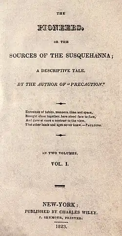 The Pioneers, or The Sources of the Susquehanna; a Descriptive Tale is an 1823 historical novel by American writer James Fenimore Cooper. It was the first of five novels published which became known as the Leatherstocking Tales. The Pioneers is the fourth novel in terms of the chronology of the novels' plots.