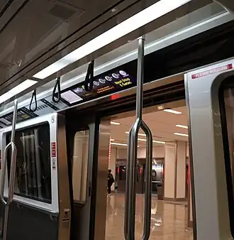On the platforms and inside the trains, color video displays provide system information in eight languages (English, French, German, Spanish, Japanese, Chinese, Arabic and Korean) as well as information about dining and shopping options in the concourses. Platform displays announce the time of arrival for the next train and its destination.