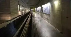 During regular service, trains run bi-directionally in the tunnels in a pinched-loop configuration.[4] The east end of the line is Concourse F, which also serves the International Terminal. During peak hours, the trains will stop at the eastbound side of the Concourse F platform, unload and then proceed further to a cross-over track to return to the westbound side of the platform. During off-peak hours, trains cross-over prior to reaching the platform and arrive/depart from the westbound Concourse F platform. At the west end, trains use a cross-over track between Domestic Terminal and Concourse T stations to switch tunnels. The system has two maintenance workshops: One at Concourse E and another at Concourse F. A third track runs parallel to the two main tracks between Concourses E and F, which connects the two maintenance facilities and is used for testing trains during maintenance.[5]