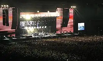 Tickets for the British leg of the tour sold out within 30 minutes, and the band played two nights at Twickenham Stadium on 8 and 9 September.[75] On 29 and 30 September 2007, Padovani joined the group on stage for the final encore of their two shows in Paris, playing the song "Next to You" as a four-piece band.[76] In October 2007, the group played the largest gig of the reunion tour in Dublin in front of 82,000 fans.[77] The group headlined the TW Classic festival in Werchter, Belgium on 7 June 2008. They also headlined the last night of the 2008 Isle of Wight Festival on 15 June,[78] the Heineken Jammin' Festival in Venice on 23 June and the Sunday night at Hard Rock Calling (previously called Hyde Park Calling) in London on 29 June.[79]