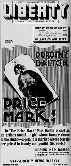 The Price Mark is a 1917 American drama silent film directed by Roy William Neill and written by John B. Ritchie. The film stars Dorothy Dalton, William Conklin, Thurston Hall, Adele Farrington, Edwin Wallock and Dorcas Matthews. The film was released on October 21, 1917, by Paramount Pictures.[1][2]