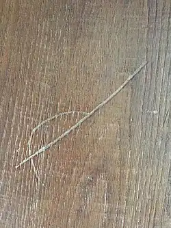 There are witch marks scratched into wood in several places in the house, including the front door and on the beam above the main fireplace. These are more properly known as apotropaic marks and were believed to prevent witches from entering the house. They are believed to date from the 17th century. Set into the ground outside the front door is a rough slab of iron which is waste from a local furnace. This was believed to prevent witches entering the house (witches were commonly believed to be scared of iron).[10]