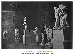 The completed groups in plaster were shipped to New York City in 1909, to be carved in marble by Furio Piccirilli.[4] The marble groups were completed in early 1910,[7] and shipped back to France to make their debut at the Salon des Artistes Francais, at the end of April.[8] Gustav Stickley's magazine The Craftsman printed nearly two pages of rave reviews, translated from French, that Barnard received for the Pennsylvania State Capitol sculpture groups.[8]