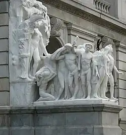 Initially, plaster of Paris short trousers were applied to the male figures, but the results proved unsatisfactory.[11] Two tents were erected on Friday, May 12, one around each sculpture group, to mask that day's removal of the plaster trousers.[11] On Sunday, the canvas walls of the tents were cut down by art-lovers who wished to view the sculptures before plaster loincloths were applied on Monday—"the great majority of the crowd being women", according to The Chicago Tribune.[11] Instead of short trousers or loincloths, the Piccirilli Brothers carved marble sheaths to cover the genitals of the male figures, for which they charged $118.50.[9]