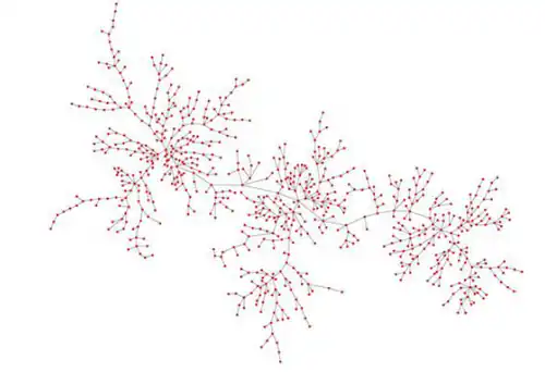 The basic "skeleton" of the network is developed by imposing on it the strongest links which were not necessarily in the MST by employing a threshold on the proximity values; they chose to include all links of proximity greater than or equal to 0.55. This produced a network of 775 nodes and 1525 links. This threshold was chosen such that the network exhibited an average degree equal to 4, a common convention for effective network visualizations. With the framework complete, a force-directed spring algorithm was used to achieve a more ideal network layout. This algorithm considers each node to be a charged particle and the links are assumed to be springs; the layout is the resulting equilibrium, or relaxed, position of the system. Manual rearranging untangled dense clusters to achieve maximum aesthetic efficacy.