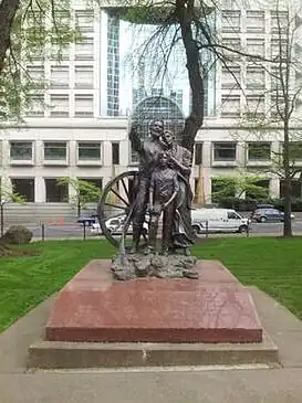 The Promised Land is a bronze sculpture by David Manuel that was formerly installed in Chapman Square (Plaza Blocks), in Portland, Oregon.[1] The sculpture, erected in 1993, depicts a pioneer family at the end of their journey. It was removed from public display in 2020 in response to vandalism and racial justice concerns during the George Floyd protests. The City of Portland is currently in the process of deaccessioning the statue from its collection.[2]